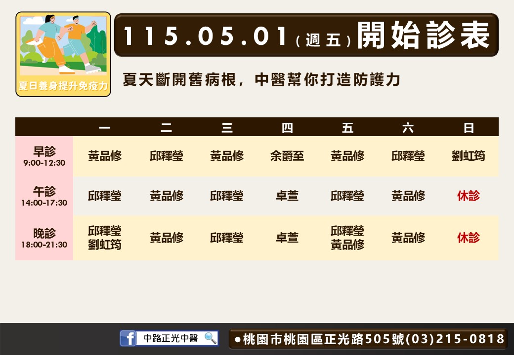 中路正光中醫診所,由邱釋瑩院長領軍新世代專業中醫師,秉持安心信任、精進醫術、美好生活、開創新局的經營理念,致力提供高品質且全面位的中醫醫療服務。主治項目包含內科疾病、皮膚疾患、腸胃疾病、過敏感冒、中風顏麻、痠痛針灸、減重美顏、小兒成長、助孕養胎等,全方位守護桃園在地鄉親全家人的健康!