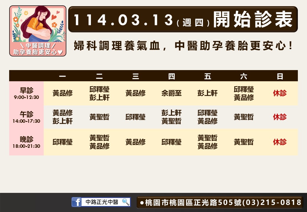 【🍀中路正光中醫診所114年3月13日開始門診表】