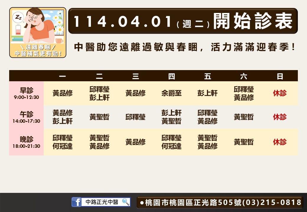 中醫助您遠離過敏與春睏,活力滿滿迎春季!|114年4月診表