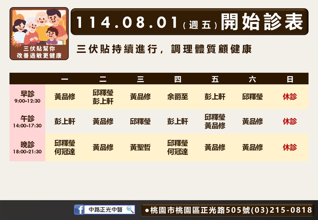 三伏貼持續進行,調理體質顧健康|114年8月診表