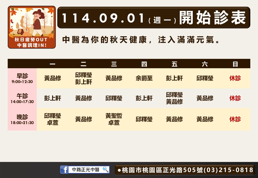 中醫為你的秋天健康,注入滿滿元氣|114年9月診表