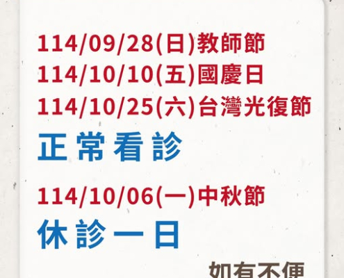 【院所公告】114年9月至10月節日門診公告2025.9.25閱讀更多 https://zhongluzhengguangmed.com/wp-content/uploads/sites/10/2025/09/553956426_122168992910453287_1980954199233825414_n.jpg 720 509 fengze.bd https://zhongluzhengguangmed.com/wp-content/uploads/sites/10/2025/02/中路正光logo_414x96.png fengze.bd2025-09-25 15:28:052025-09-25 15:28:05【院所公告】114年9月至10月節日門診公告